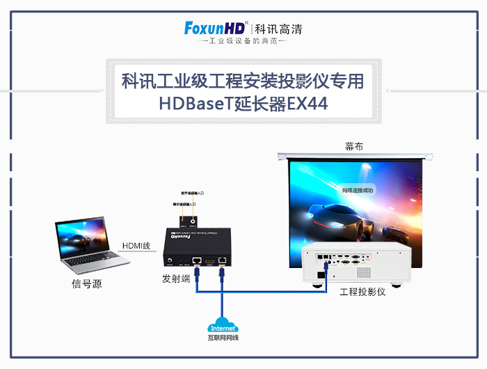 HDBaseT技术标准的广泛应用,越来越多的显示设备支持HDBaseT技术的标准端口,特别是工程投影仪行业,HDBaseT接口已然成为标配。4K极清显示走入工程安装的各个角落,信号源与显示设备的距离越来越远,传输延长设备的重要性已成为工程安装中不可缺少的核心装备。FOXUNHD科讯高清是国内最早成为HDBaseT会员的研发型生产企业,紧跟HDBaseT技术更新与发展,并针对技术应用研发同步产品上市销售。科讯从最初的HDBaseT1.0技术研发EX33/EX34/EXKVM等市场上代表性产品到最新HDBaseT2.0技术的EX53/EX55。根椐现场环境应用FOXUNHD科讯高清创造性研发出HDBaseT矩阵、HDBaseT分配器、HDBaseT切换器等一系列配套产品。
