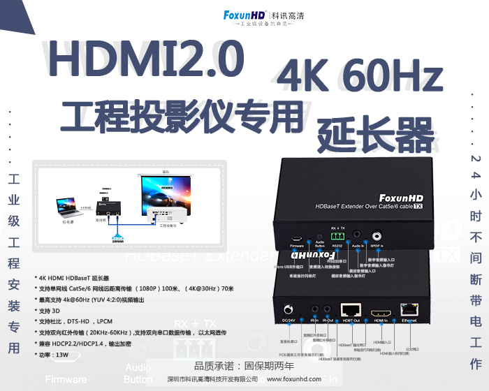 FoxunHD科讯高清坚持按HDBaseT技术标准,坚持选用正规电子原材料,坚持以工业级工程安装专用设备的要求生产设备。科讯EX44按通用HDBaseT技术标准生产,兼容市面上所有HDBaseT技术标准的工程投影仪,EX44严格执行科讯工业级设备的生产规范,面前所有应用环境做到24小时带电工作质保两年,选择科讯选择稳定可靠,科讯让工程传输更放心。