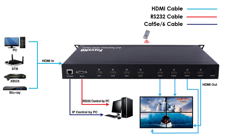 SMX44 4x4 Seamless HDMI Matrix With 2x2 Video Wall Controller