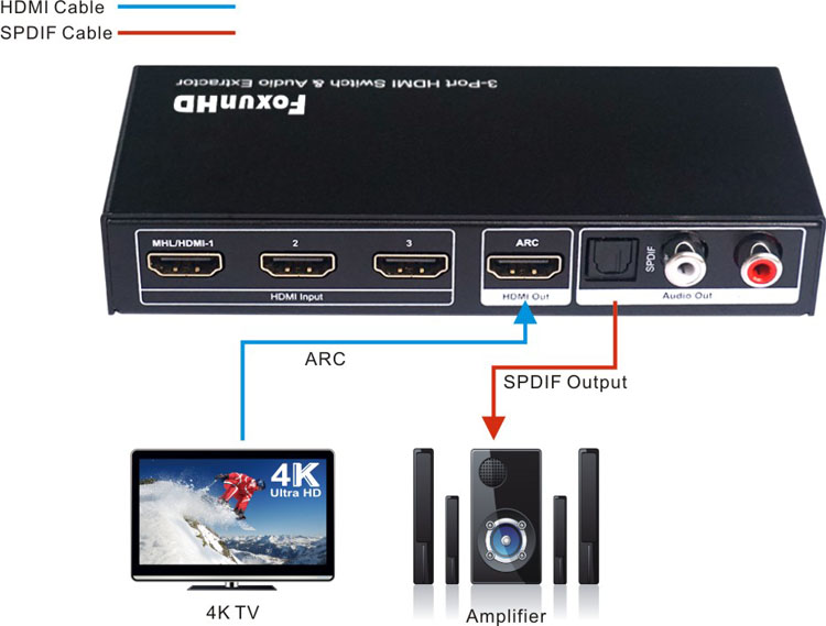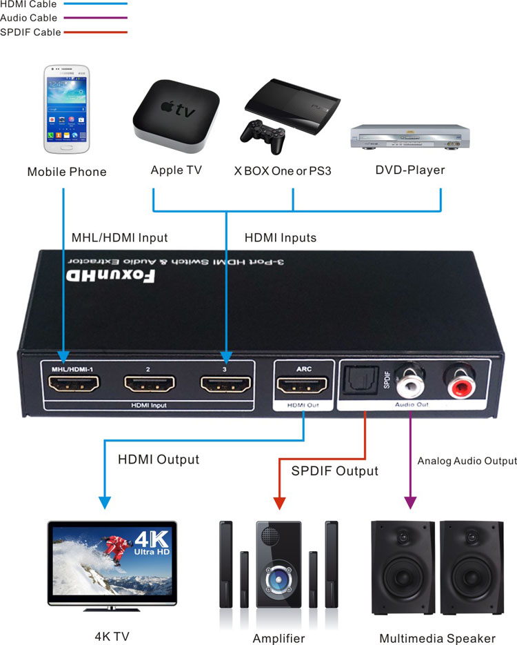 3)Connect HDMI TV to the output of HDMI Switch.