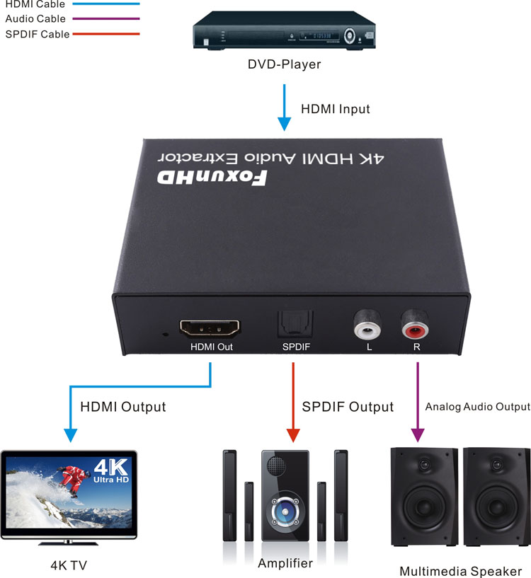 2)Connect the HDMI display device (such as: HD-LCD, HD-DLP) into HDMI output of 4K HDMI Audio Extractor.